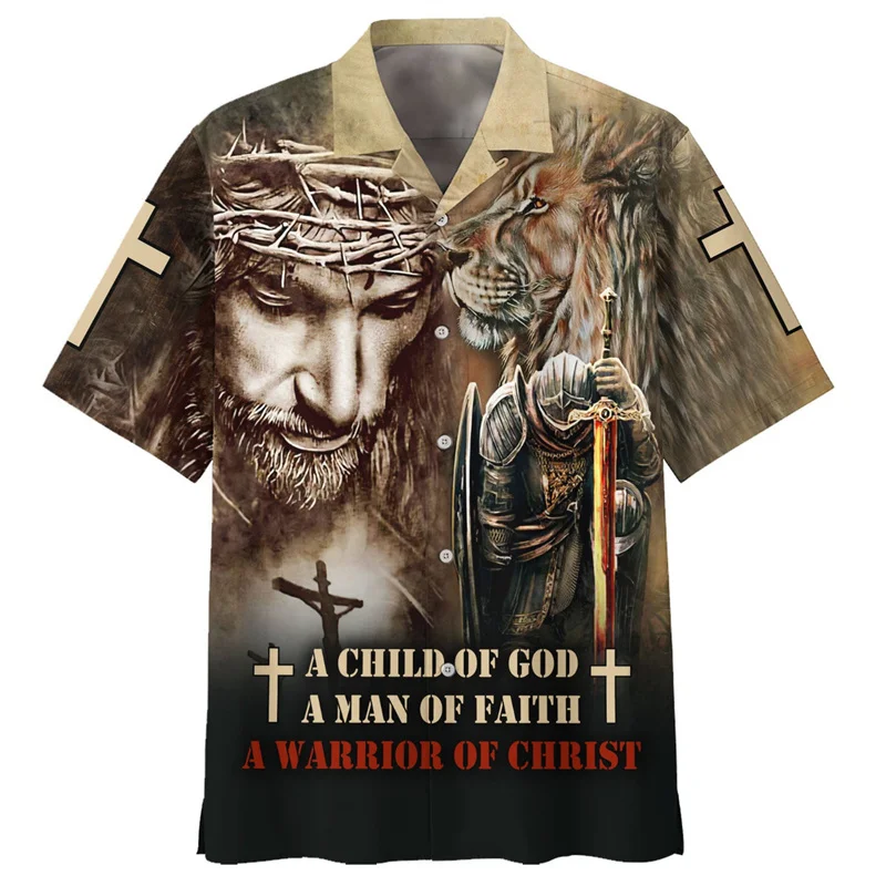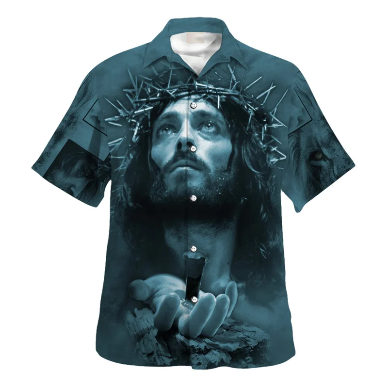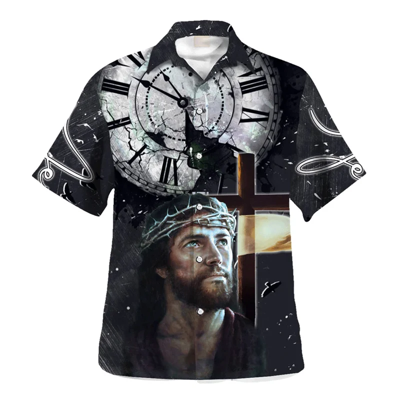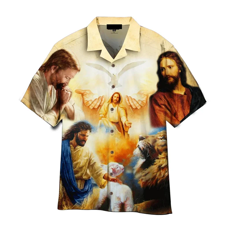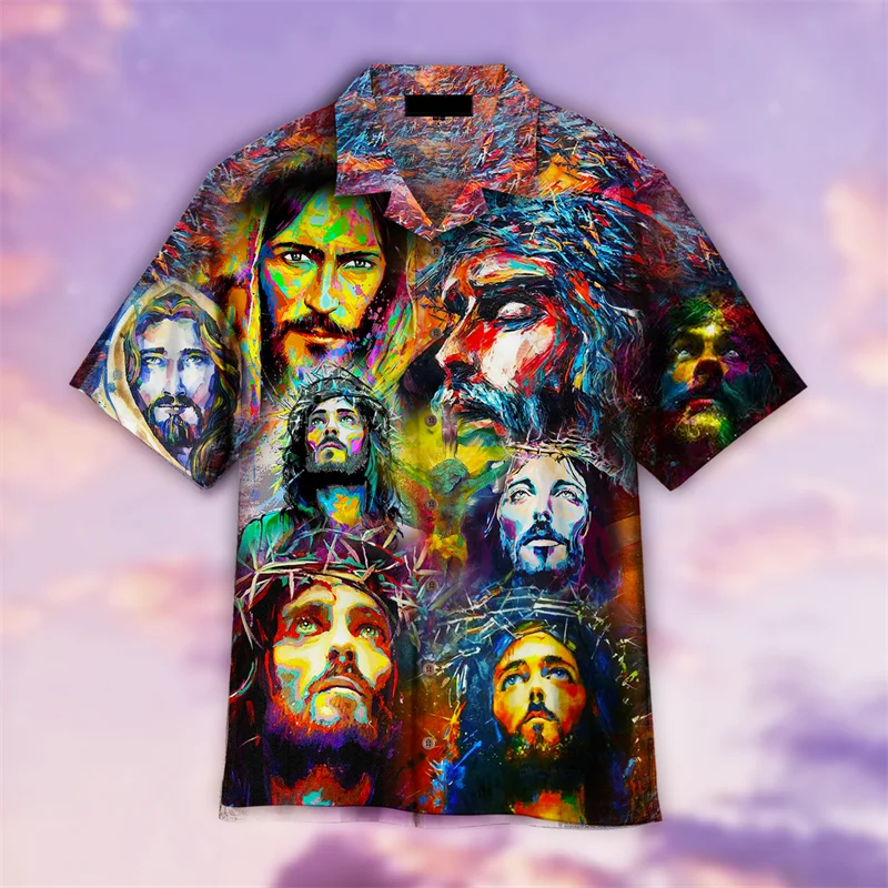 Mens Vintage Jesus Graphic Hawaiian Shirts Fashion 3D Printed Christianity Shirts Tops Summer Short Sleeves Button Blouse Shirt